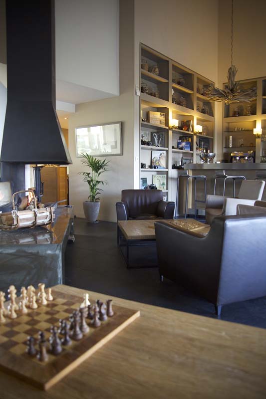 Un living room où une magnifique cheminée crépite … avec un petit bar.