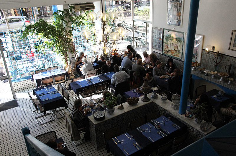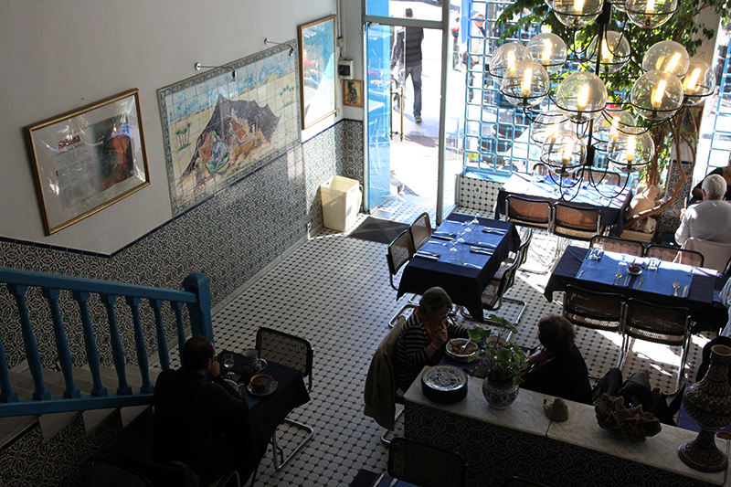 Avec ses grandes baies vitrées et ses lustres, ses faïences colorées, ses touches de bleu sur les nappes et les bois, le restaurant restitue au cœur de Marseille l’ambiance tunisienne de Sidi Bou Said.