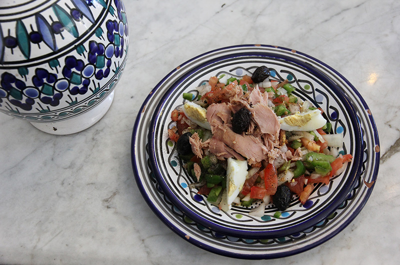 Salade mechouia, brick aux crevettes, chorba ou soupe tunisienne précédent les couscous à l’agneau au poisson