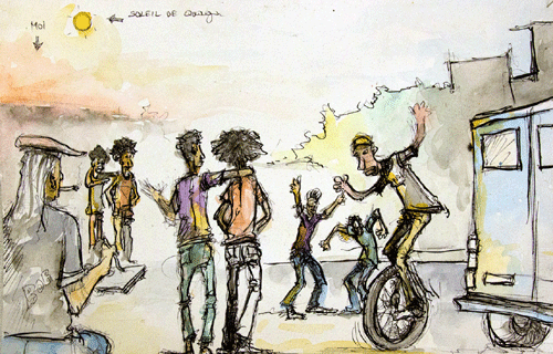 Aventure artistique et humaine … Pendant 10 jours, six artistes burkinabés et six carnettistes français ont ensemble promené leurs pinceaux et leurs crayons dans les rues ouagalaises. En résidence et en partage, un regard croisé d’artistes qui à l’occasion du festival « Rendez-vous chez nous » a créé de fabuleuses histoires en couleurs sur d’incroyables carnets…