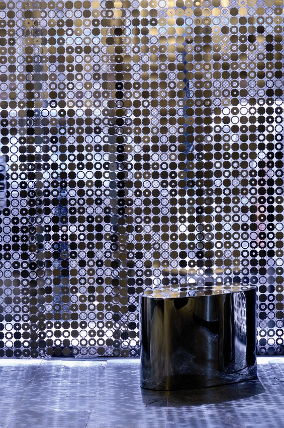 A l’intérieur, la salle des rencontres est gigantesque : 575 m2. Elle prend des allures de discothèque année 70 grâce à ses murs en Metalex (plaquettes en aluminium Le Labo design) et son plafond de feux d’artifices.