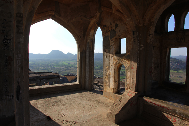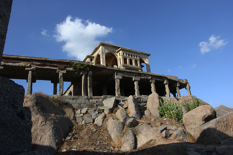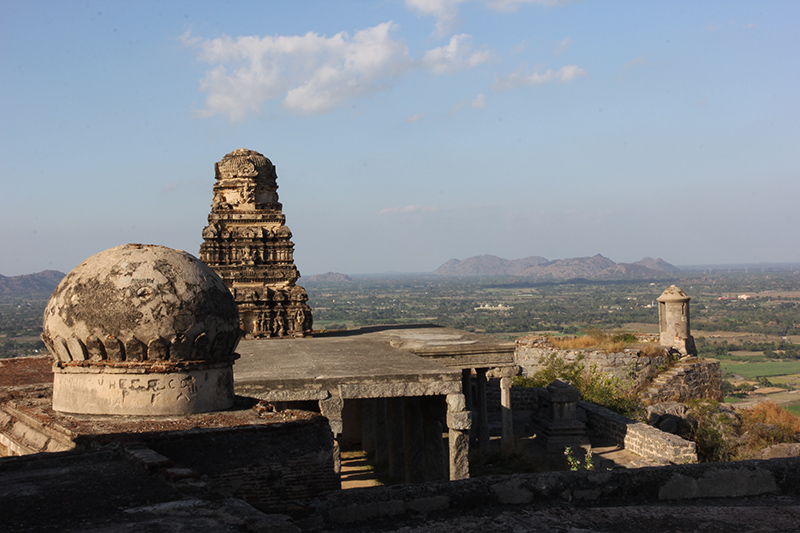 Ces collines couvertes d’un impressionnant amas de gros blocs rocheux polis par le temps sont courantes dans cette région du Tamil Nadu. A l’assaut de l’une d’elles, le visiteur croise des singes un peu chapardeurs (parait-il !), des lézards géants, des vaches. C’est loin d’être un  grand sommet, pourtant l’ascension est assez fatigante car les marches de granit sont irrégulières et la montée est parfois un peu raide. Mais il suffit de s’arrêter quelques instants pour reprendre son souffle et faire une pause photo ! Après de multiples passages et portes, la citadelle principale se découvre enfin sur une large plateforme où  campent de nombreux bâtiments. L’architecture garde les traces de ses multiples occupants et fait de ce lieu un étrange jardin aménagé et suspendu entre ciel et terre.  La vue est extraordinaire sur des kilomètres à la ronde. La tranquillité, plus un bruit …  Parfait pour une méditation. Entre fin décembre et fin février, c’est le plus beau moment pour découvrir le paysage … Quand les rizières sont verdoyantes et les lacs naturels encore pleins.