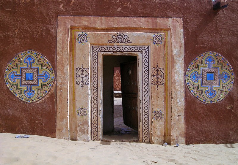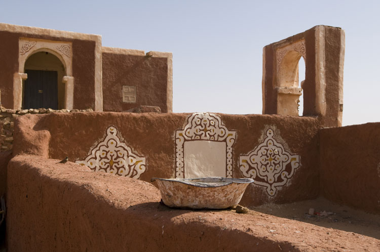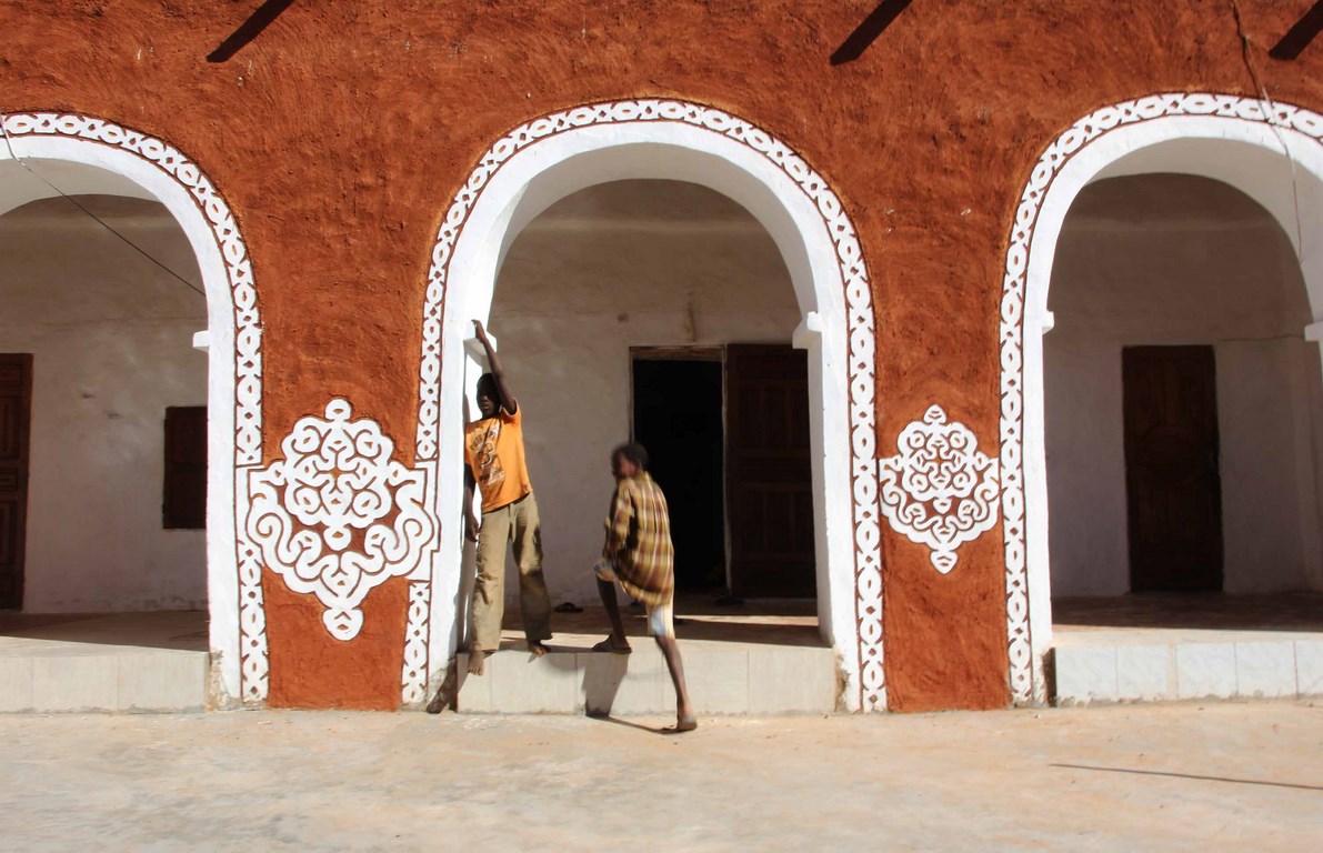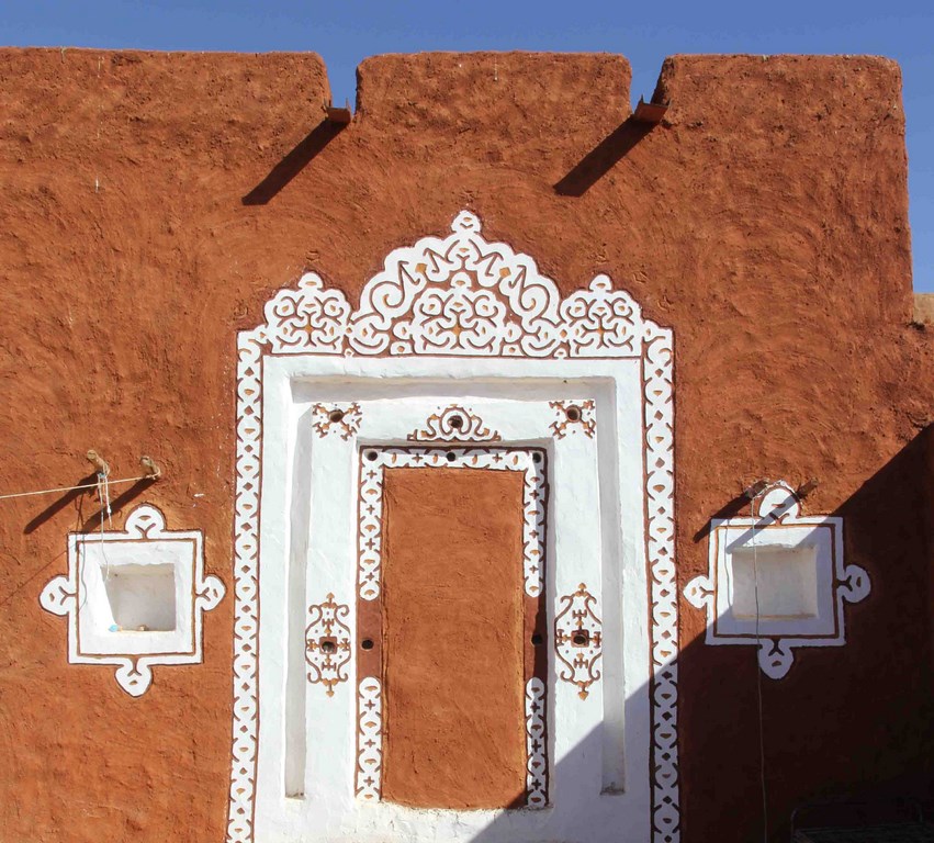 Mais Oualata se distingue des autres villes par les incroyables décors peints sur les maisons. Les encadrements des portes et des fenêtres sont soulignés de bandeaux blanchis ornés de motifs abstraits, d’entrelacs et de signes à la géométrie universelle. Dans les plus belles maisons, les cours et les pièces intérieures revêtent l’enduit blanchi fait de kaolin et de gomme arabique sur lequel les motifs à entrelacs rouge de terre viennent rythmer niches et colonnes.