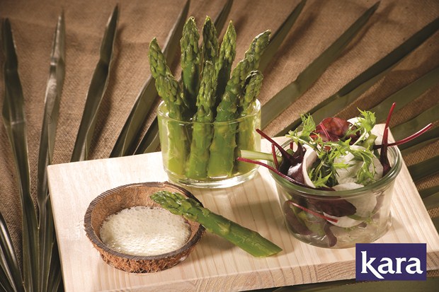 2. Réaliser la sauce mousseline : dans un bol, mélanger à l’aide d’un fouet, la mayonnaise avec le lait de coco Kara, le gingembre haché finement, le miel liquide. Râper le zeste des 2 citrons combawa, utiliser une passette à thé et presser le jus dans la préparation. Vérifier l’assaisonnement. Quelques gouttes de tabasco peuvent être ajoutées pour pimenter la sauce mousseline.