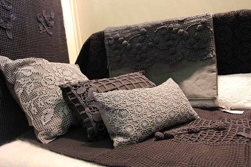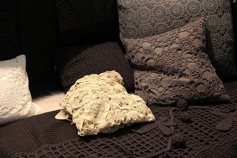 C’est à Lyon, dans son atelier, que Véronique recycle, teint et assemble entre elles ces pièces uniques, leur donnant une seconde vie. Naissent ainsi une alchimie entre tradition et modernité, matières et textures. Coussins, plaids, chemins de lits ou jetés de canapé, sont traités dans les tonalités monochromes anthracite, ficelle, bleues, et noires. Les pièces uniques deviennent de véritables pièces d’exception, magnifiées par l’association du lin aux nuances subtiles, par la douceur du coton perlé associé à la rugosité des cotons bruts.