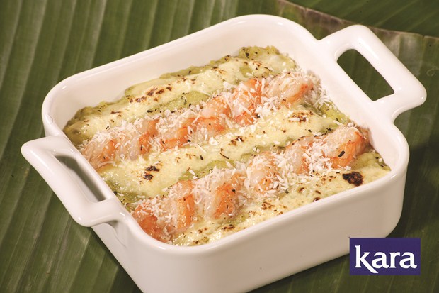 4. Fouetter le jaune d’œuf avec le reste crème de coco Kara, de coco râpée et de parmesan et verser délicatement sur la pomme de terre sans recouvrir les crevettes.