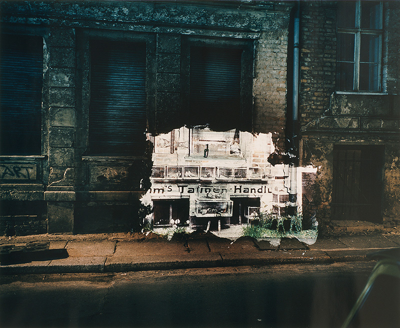 A propos de Pierre Faucher ….Dans la série « Le paysage français », la baraque verte surmontée d’une cheminée, associée à un portail Lapeyre ou à une église, reste abstraite dans son usage, simple leitmotiv des périmètres résidentiels. Une tâche de peinture noire fait inévitablement ressurgir sous la forme du trou, ce qui reste difficile à affronter dans notre mémoire individuelle ou collective, ce gouffre où les images sont insupportables. E. Fredet