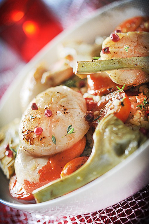 5) Dresser le boulgour aux légumes dans une assiette accompagné des noix de Saint-Jacques. Arroser de sauce à l’orange. Parsemer de persil plat et ajouter quelques baies roses.