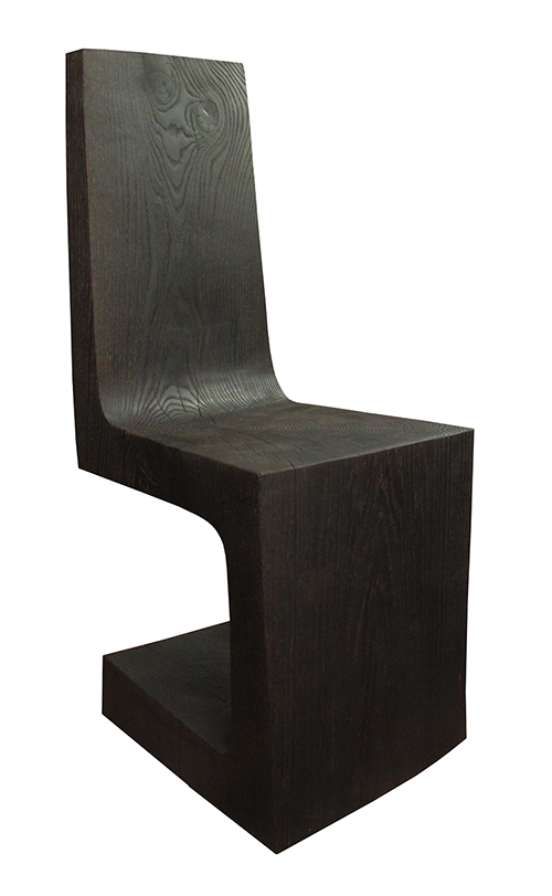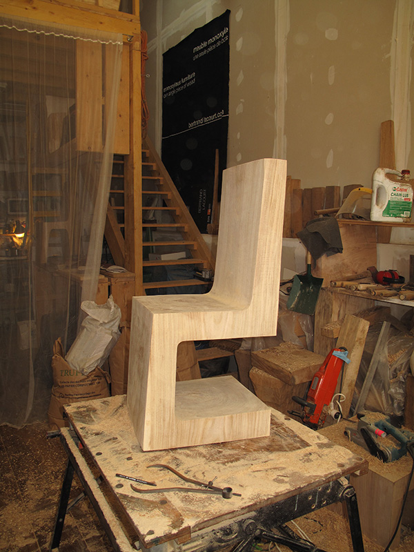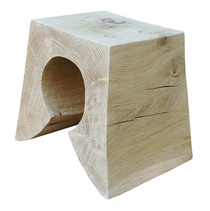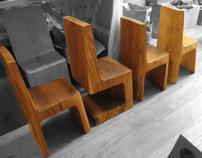 Mes objets (chaises, bancs, tabourets et éclairages) sont taillés directement dans des troncs d’arbres. Ils sont sculptés d’un seul tenant dans un bloc de bois unique, sans aucun assemblage: ce sont des monoxyles.