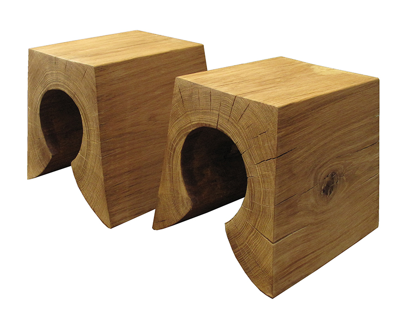 The creation process starts in the woods in Châtillon-sur-Seine (21), Burgundy. The trees come from sustainably managed forests. I use mostly oaks, but also maples, beech trees and ash trees. I seek the closest contact with the natural material. My technique of direct carving, on-site, is a blend of logging and sculpture. The shaping of a piece is done for a large part using traditional tools (draw knife, adze, spokeshave). Axes are replaced by chain saws, which I use to rough out the piece from the undressed timber. The process continues in my workshop in Arcueil (94), just outside Paris. I use a specific technique for the drying of thick pieces of wood. For the finishing, I use biodegradable products. I also perform operations of bleaching, superficial burning and wood ebonization.