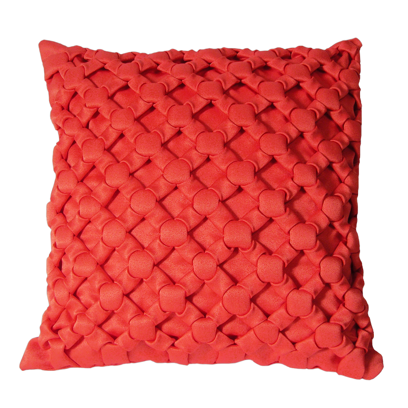 Ce coussin corail est entièrement réalisé à la main en Colombie. La couturière crée ses volumes uniquement en cousant au fil et à l’aiguille selon une trame précise qui fait naître les graphismes.