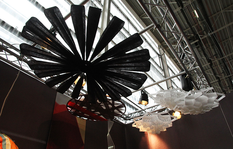 Le pique-fleur CE SOIR OU JAMAIS de Marianne Guedin, les bijoux FUSOR INGNICOLOR de Laurent Godart et Chinh Nguyen… Les artistes designers ont conçu d’autres formes et objets… Janique Bourget a découpé ses motifs en 3D pour SLIT. Isabelle Daëron crée le tapis ISHIHARA et Sophie Larger invente ENVOL, une somptueuse balançoire réalisée à partir de chutes de cartons déchiquetés.