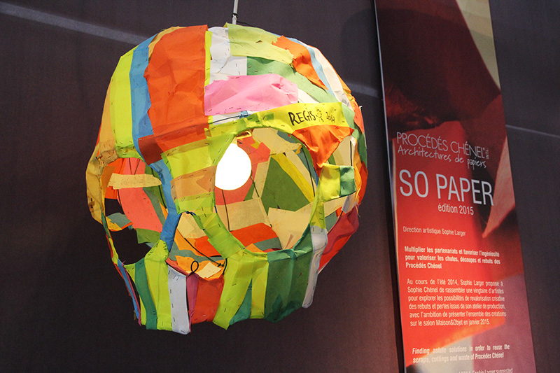 Multiplier les partenariats et favoriser l’ingéniosité pour valoriser les chutes, découpes et rebuts des Procédés Chénel. Voilà une très belle idée ! Au cours de l’été 2014, Sophie Larger, directrice artistique de So Paper, propose à Sophie Chénel, directrice des Procédés Chénel, de rassembler une vingtaine d’artistes pour explorer les possibilités de revalorisation créative des rebuts et pertes issus de son atelier de production, avec l’ambition de présenter l’ensemble des créations sur le salon Maison & Objet en janvier 2015. La première rencontre physique a lieu fin septembre dans les ateliers Procédés Chénel. Les artistes échangent et dialoguent avec les artisans. Dès lors, ils apprendront à lire les propriétés du matériau DROP Paper et à envisager de nouveaux potentiels d’utilisation, mettant en œuvre leur imagination et créativité.