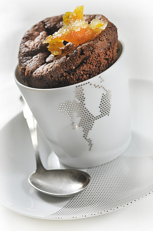 6) Avant de servir, creuser un trou au milieu de chaque soufflé et verser 1/2 cuil. à café de confiture d’oranges.
