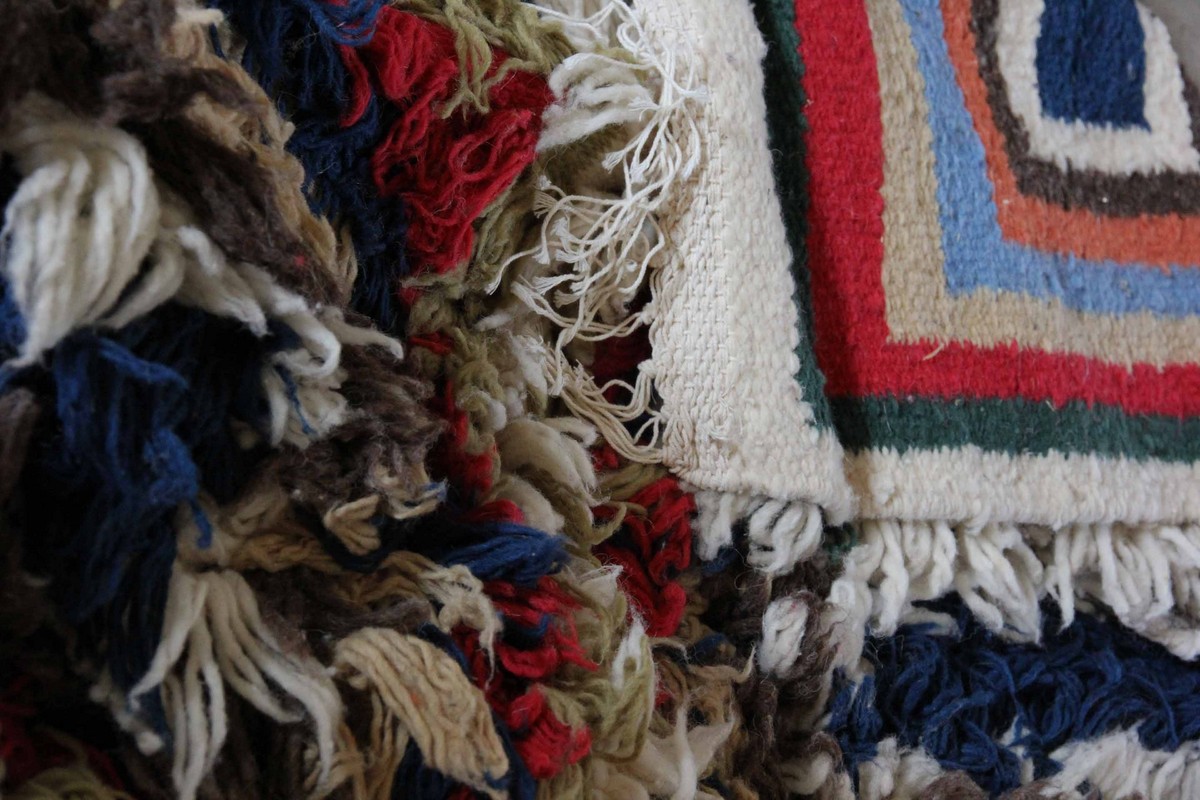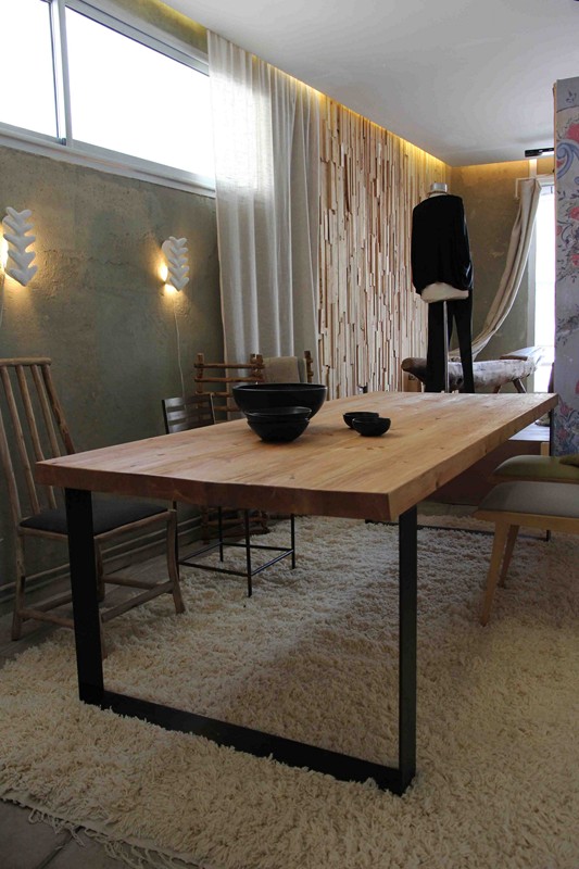 Ce mobilier contemporain décrit un artisanat revisité et vintage d’inspiration post-industrielle en métal et bois. La jeune femme mixe les  genres dans le mobilier, les objets, mais aussi le textile en créant un étonnent motif de grosses fleurs pixellisées aux couleurs éclatantes…Né d’un travail commun avec son père, Tinja a maquetté un tapis avec  un nouveau graphisme s’inspirant de dessins anciens. Il  est tissé et teint avec des colorants naturels par l’artisane!  Ce chatoyant tapis complète  une belle gamme de pièces plus ébouriffées  ou classiques, très colorées ou aux motifs berbères mais toujours en haute laine.
