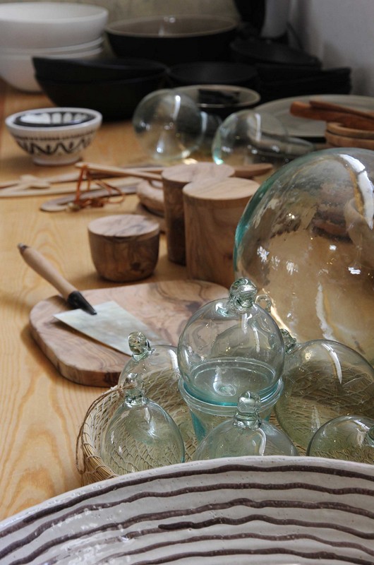 Chez Tinja comme dans un  concept-store, les matières naturelles se déclinent en accessoires « art de vivre » variés. Plaid et coussins en laine de Sidi Bouzid, aux motifs noirs et blancs, vêtements vintage, plats, bols, ustensiles, boites, et une très jolie collection de bijoux en  bois d’olivier… I