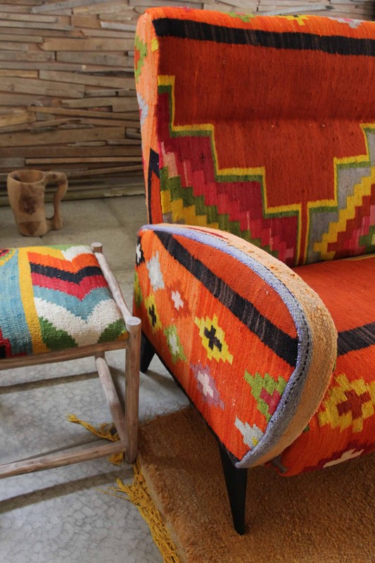 La ligne Korsi, quant à elle, présente des pièces chinées aux formes XIXème baroques, revisitées. Les assises revêtent des peaux de chèvre ou de mouton, de large tricotage ou d’antiques kilims