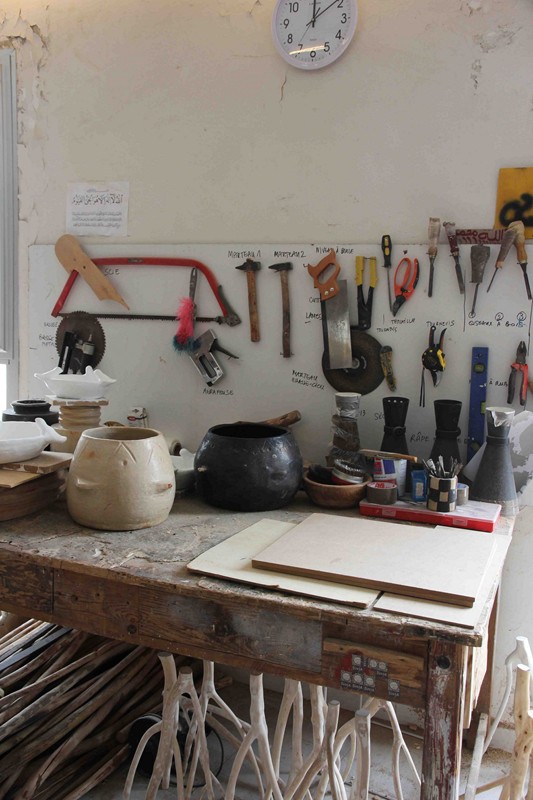 La finition de toutes les pièces est réalisée dans l’atelier de Tinja. Dans un même temps, le designer s’intéresse au bois de palmier. Ce dernier matériau  issu de la tradition locale et africaine ré exprime sa rusticité et son élégance dans un petit mobilier en souvenir de la communauté soudanaise installée depuis des générations en Tunisie.