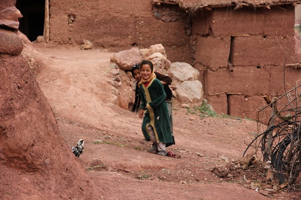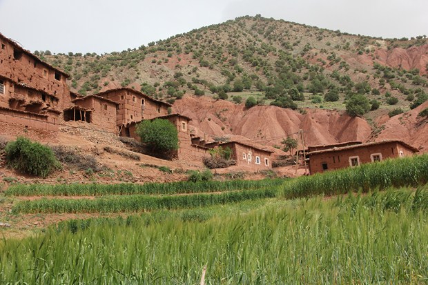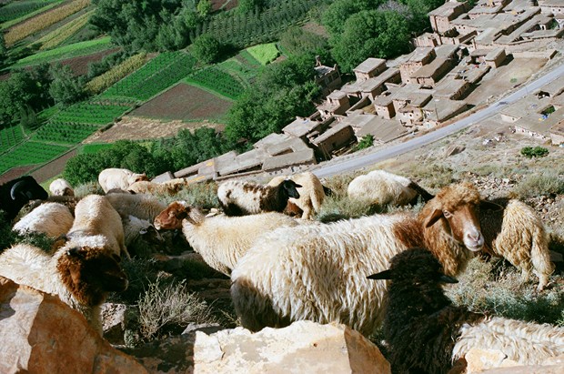 Dans le Haut -Atlas, la vallée des Ait Bougmez  à plus de 2000 m d’altitude serpente tranquillement entre les majestueux  massifs montagneux affleurant le ciel. La nature est ici souveraine laissant aux bons soins des hommes  d’étroites vallées. Irriguées par de nombreux canaux, la terre arable est cultivée jusque dans ses moindres recoins. L’orge, le blé, les pommes de terre composent autour des vergers de pommiers un fabuleux patchwork.  Le travail se fait à la main et les sillons de l’araire sont tracés  par les bêtes. Retenus par des murets de pierre, d’autres cultures en terrasses soulignent le paysage et les villages agrippés au flanc des montagnes. Accolées entre elles, les maisons graduées en hauteur par de petites fenêtres grillagées  se colorent de rouge et d’ocre.  La lumière  fait à chaque heure du jour des miracles !
