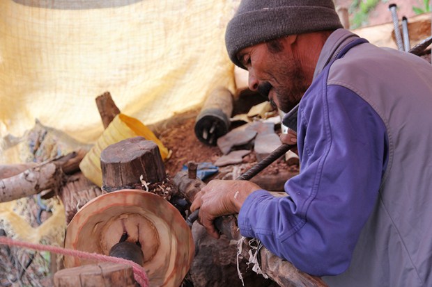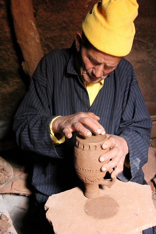 .Dans la vallée des Aït Bowli, Brahim, le potier, modèle toutes sortes de pièces sur son tour. Proche de son petit atelier, les foyers de cuisson sont creusés dans la terre. Le vieil artisan, qui travaille aussi sur commande, produit des canaris pour l’eau, des plats, des cruches de formes traditionnelles. Après lui, personne ne semble plus s’intéresser à ce savoir-faire ! Sur l’autre versant d’Igleouane, Houssine a inventé un système ingénieux pour entrainer son tour à bois. Dans ses mains expertes, le bois des noyers de la vallée se transforme en grand plat ou assiette, qu’il rehausse de motifs avec la terre colorée avant de les immerger dans un bain d’huile. Recherchées, ces productions artisanales s’achètent aussi tous les samedis sur le marché d’Abachkou. Réservé aux femmes, le tissage est pratiqué dans beaucoup de village et beaucoup de maison. Assises devant le métier de haute lisse, elles manient la laine et confectionnent des couvertures et des tapis. Les moutons, les chèvres aussi fournissent l’essentiel de la matière première. Des couleurs naturelles aux teintes rouges ou plus « flashies », ces femmes de tous les âges connaissent par cœur le répertoire des motifs qu’elles composent magnifiquement en jours passés.