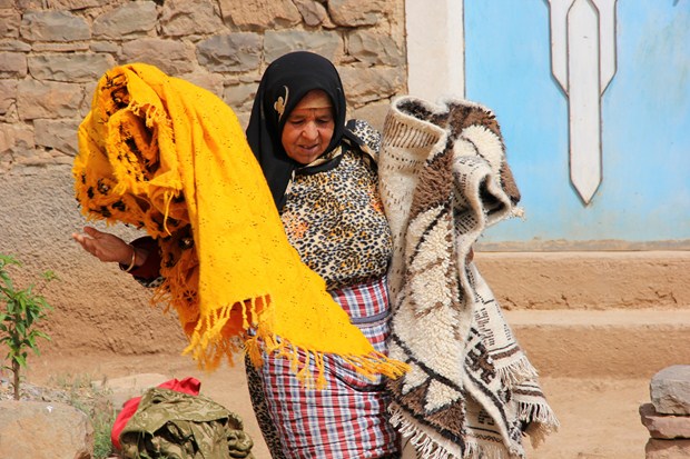 .Dans la vallée des Aït Bowli, Brahim, le potier, modèle toutes sortes de pièces sur son tour. Proche de son petit atelier, les foyers de cuisson sont creusés dans la terre.  Le vieil artisan, qui travaille aussi sur commande,  produit  des canaris pour l’eau, des plats, des cruches de formes traditionnelles.  Après lui, personne ne semble plus s’intéresser à ce savoir-faire ! Sur l’autre versant d’Igleouane, Houssine a inventé un système ingénieux pour entrainer  son tour à bois. Dans ses mains expertes, le bois des noyers de la vallée se transforme en grand plat ou assiette, qu’il  rehausse de motifs avec la terre colorée avant de les immerger dans un bain d’huile. Recherchées, ces productions artisanales  s’achètent aussi tous les samedis sur le  marché d’Abachkou. Réservé aux femmes, le tissage est pratiqué dans beaucoup de village et  beaucoup de maison.  Assises devant le métier de haute lisse, elles manient  la laine et confectionnent des couvertures et des tapis. Les moutons, les chèvres aussi fournissent l’essentiel de la matière première. Des couleurs naturelles aux teintes rouges ou plus « flashies », ces femmes de tous les âges connaissent par cœur le répertoire des motifs qu’elles composent magnifiquement en jours passés.