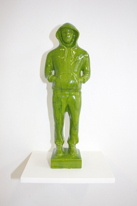 Enfin, trônant sur un socle-piédestal dans l’espace de la galerie surgit E.T, figurine en céramique émaillée de couleur verte d’un jeune homme dont le look et l’attitude (jogging, baskets, cagoule, mains dans les poches) évoquent le garçon de banlieue et par conséquent des problèmes sociaux comme ceux des inégalités, de l’intégration des minorités, de la violence… En quoi le sort de ces garçons de banlieue soulève les questions écologiques et environnementales ? E.T représente un être hybride né d’une rencontre improbable entre un personnage vivant en milieu urbain et la nature.