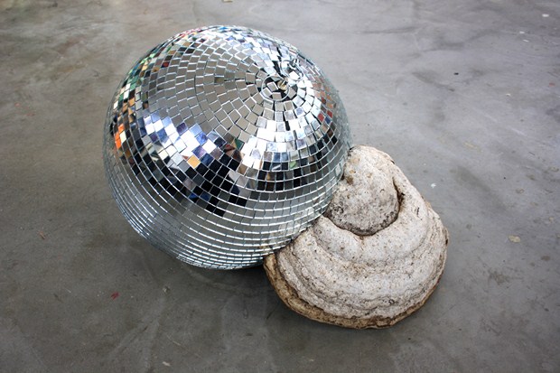 Au sol, Big-bang, une boule à facettes sur laquelle a poussé un amadouvier, champignon de souche, intrigue. L’excroissance naturelle de l’objet artificiel semble provenir ou créer du chaos.