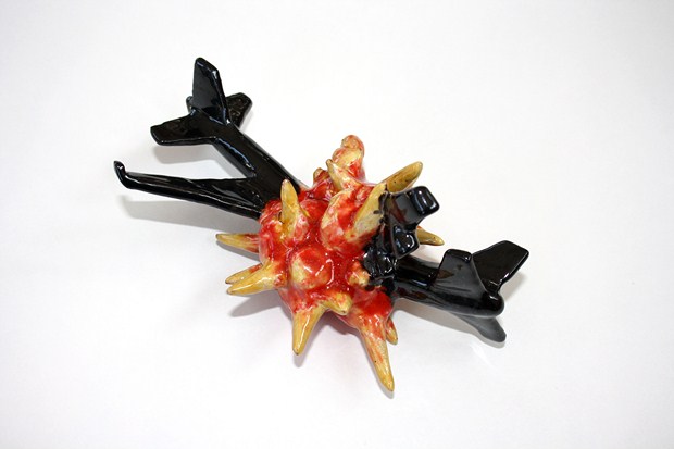 Survient alors une nouvelle explosion, un crash entre deux avions que représente Small middle-class explosion. Cette œuvre provient d’une série de céramiques émaillées représentant une multitude d’explosions de petites tailles. Ces dernières, comme sorties d’un écran de télévision ou d’ordinateur, correspondent à des explosions d’appartement, apprivoisées, domestiquées. La violence prend alors une apparence classe moyenne.