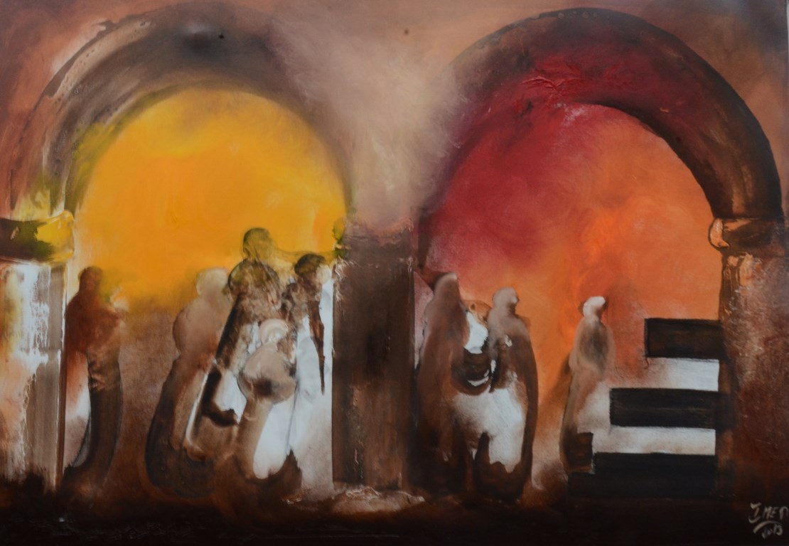Avec cette exposition parisienne , elle a puisé son inspiration dans les architectures médinesques, les mosaïques ottomanes, les scènes de la vie quotidienne de Tunisie, mais aussi du Maroc, de Turquie, dans une palette de couleur qui s’apparente aussi aux tonalités arabo-andalouses : ocres, dorés, traversés par du noir et blanc, des gris illuminés par le bleu outremer porteur d’espoir et la force des turquoises.