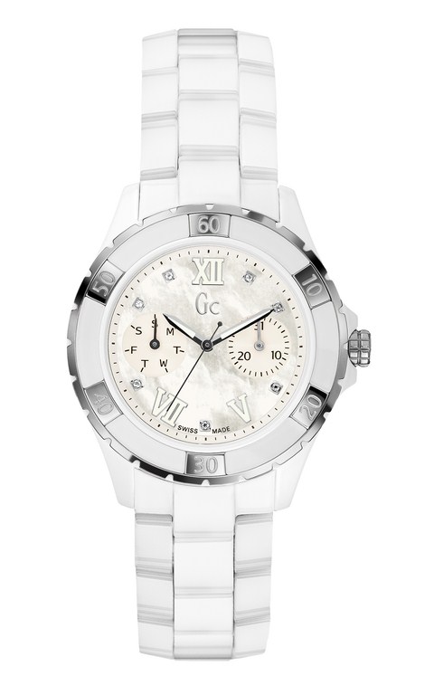 Sport Class XLS Glam, boîtier céramique blanche, cadran fond nacre avec 7 diamants, lunette avec inserts cristal, verre saphir, bracelet céramique blanche, 1050€
