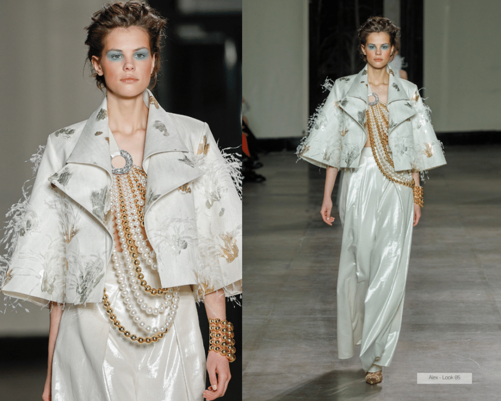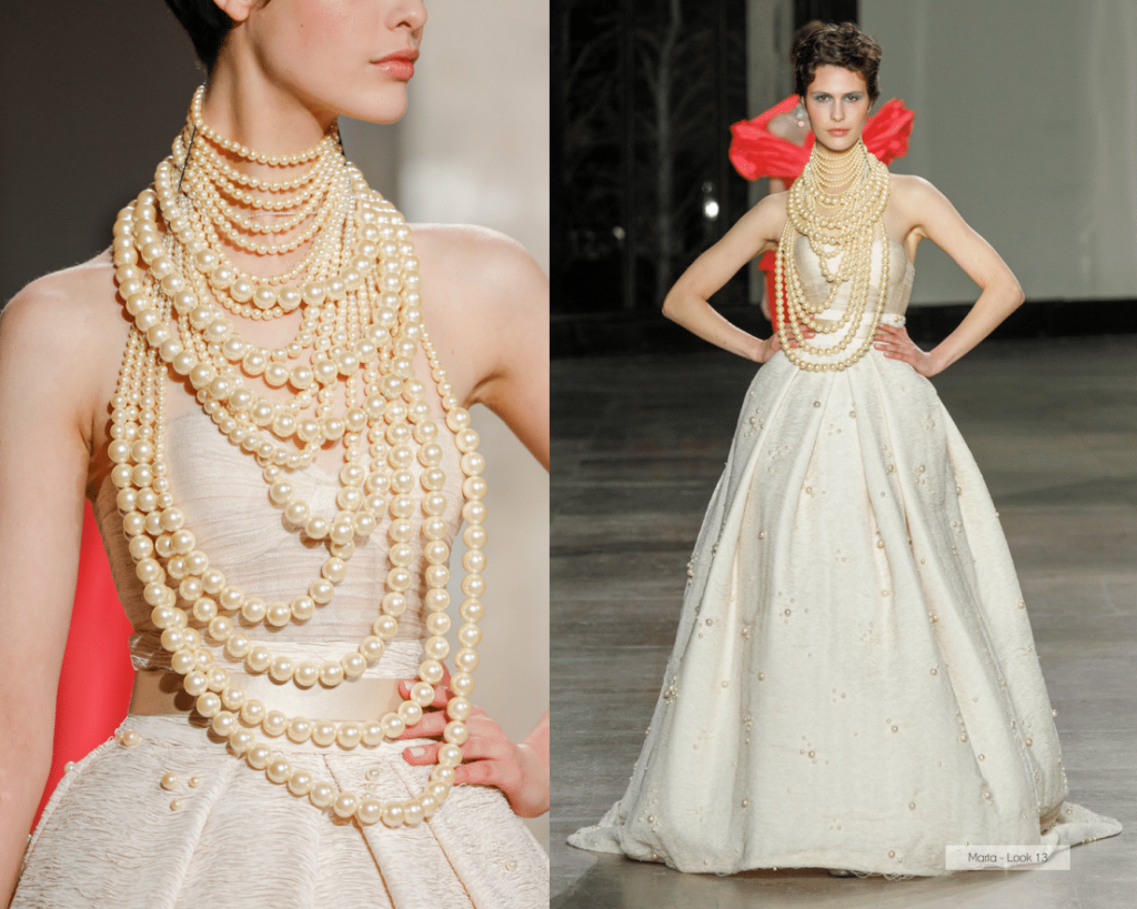 Georges Chakra. Nous aimons les accesssoires, des cascades d’énormes perles habillent des