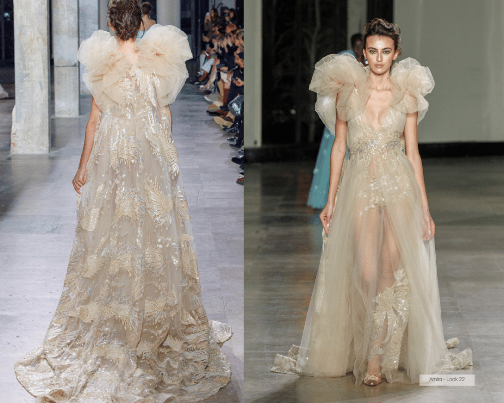 Les bustiers sont ajustés, mettant en valeur des corps sylphides, des traines interminables en mode couture.